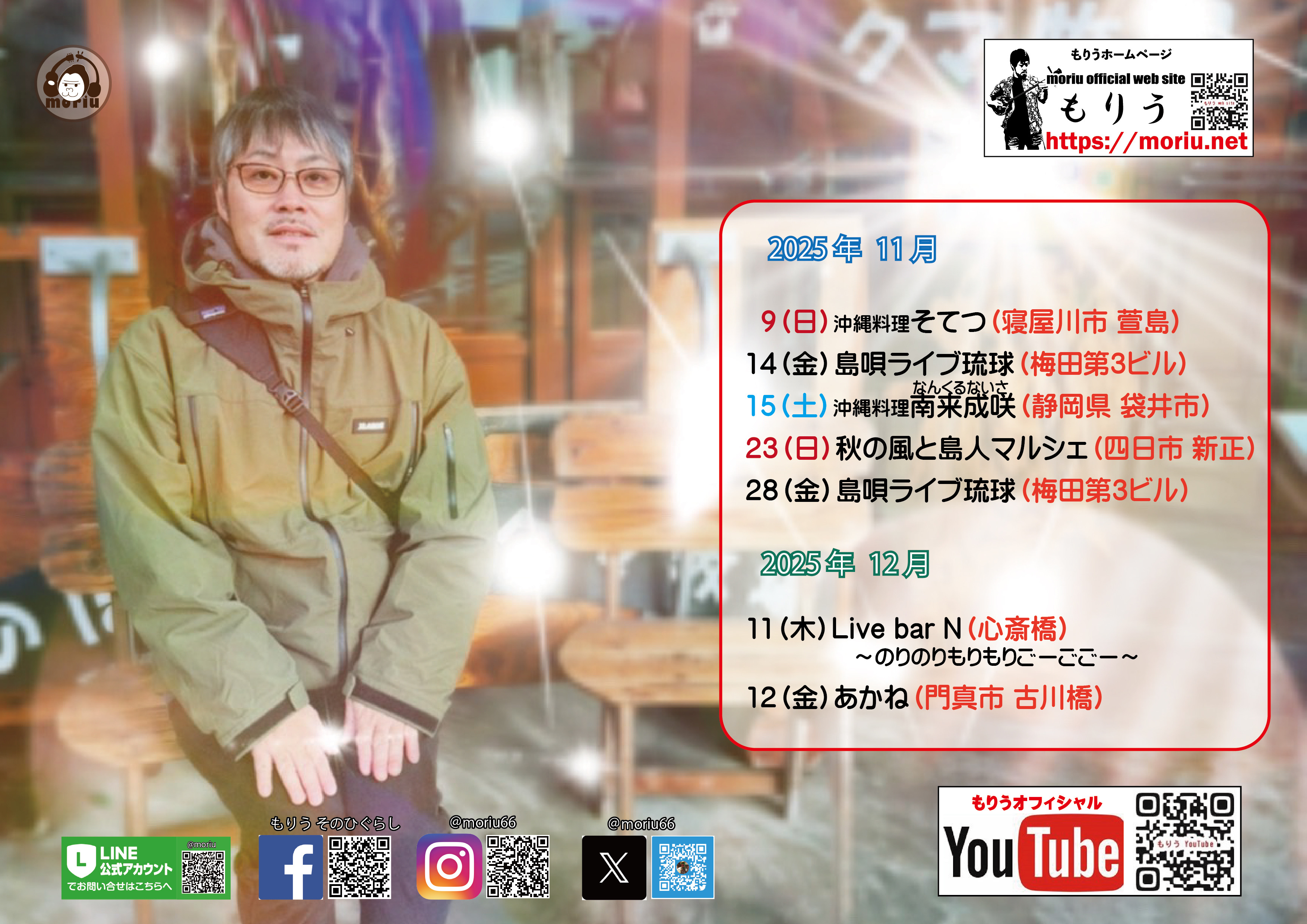 ◆2025.11月 島唄ライブ 琉球(大阪 梅田)出演日決定!